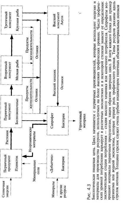 На рис. 4.3 показана упрощенная морская пищевая цепь. В дополнение, к доминирующим участникам трофических уровней включен «добытчик», поскольку минеральные вещества, полученные из неорганических резервуаров, необходимы для жизни. Обратите внимание, что пищевая цепь не является полностью последовательной: например, «разлагающие» получают продукты для жизнедеятельности с разных трофических уровней. Бактерии работают как «добытчики» и как «разлагающие» oдновременно, получая углерод в результате одной деятельности и минералы в результате другой. Всеядные (питающиеся более чем на одном трофическом уровне) распространены в природе, но осложняют диаграмму пищевой цепи, не добавляя концептуального понимания, поэтому они не включены в диаграмму.