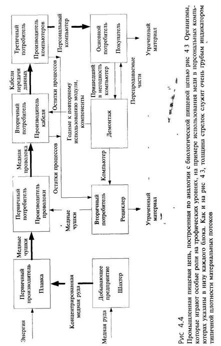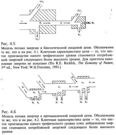 На рис. 4.4 представлена упрощенная промышленная пищевая цепь, также не показывающая «всеядных». Оказывается, что биологические и промышленные трофические уровни могут быть описаны в сущности с использованием той же терминологии. Но наиболее интересны при сравнении двух диаграмм, возможно, не сходства, а различия.