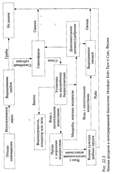 3. EIР 3-го типа: между расположенными рядом фирмами в определенной промышленной зоне. Организации, расположенные близко друг к другу, возможно, в промышленном парке, организуются так, чтобы обмениваться энергией, водой и материалами. Пример такой системы – Моnfоrt Воуs Town в Суве, Фиджи (рис. 22.3). Здесь отходы пивоварения обеспечивают создание, EIР, включающего выращивание грибов, разведение свиней и рыбы и овощное хозяйство.