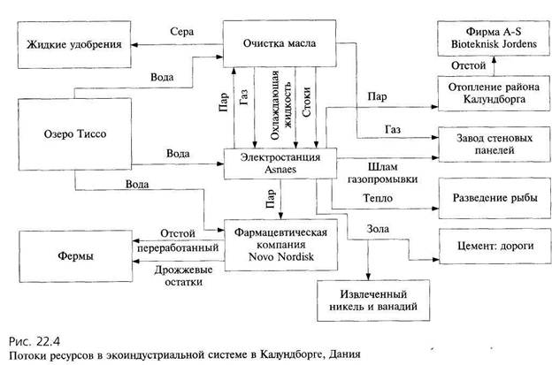 Примером системы 4-го типа может cлужить Калундборг (Kalиndborg), Дaния, в котором несколько фирм в радиусе 3 км обмениваются паром, теплом, золой, серой и рядом других ресурсов (рис. 22.4). Не сформированный как EIP, Калундборг стал им, образовав ряд «зеленых объединений», каждое из которых было экономически выгодным.