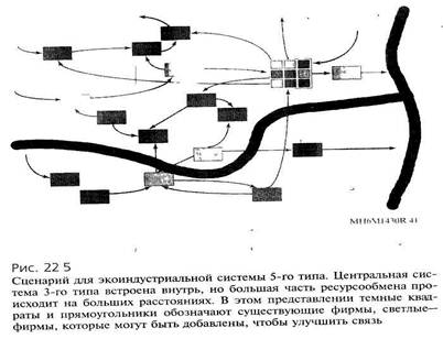 Как можно разработать эффективную промышленную экосистему? Кажется очевидным, что в такой системе должно быть широкое отраслевое и пространственное распределение участников, она должна быть гибкой и инновационной. Вероятно, будут включены некоторые типы EIР. Эта концепция показана на рис. 22:5. Система иллюстрирует компоненты 3-го, 4-го и 5-го типов и вероятно, что в такой системе будут также происходить взаимодействия l-го и, возможно, 2-го типа.