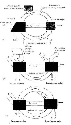 Поток питательных веществ и энергии в отдельных организмах, как биологических, так и промышленных, был описан в гл. 4. Во многом подобным образом можно изучить потоки для целых экосистем. Версия БЭ показана на рис. 22.7,а. Здесь в системе 11 типа питательные вещества в значительной степени рециклируются, но поток энергии строго линеен. Система стабильна во времени, поскольку на временных шкалах сотен миллионов лет источник энергии - Солнце - неисчерпаем.