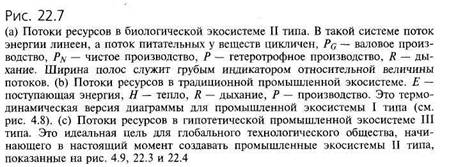 Диаграмма потока ресурсов для современной промышленной экосистемы II типа показана на рис. 22.7,b. Два различия между этой системой и системой на рис. 22.7,а очевидны: система ПЭ одновременно линейна как по энергии, так и по питательным веществам, и энергия поступает на уровень как экстрактотрофа, так и трансформотрофа. Система неустойчива во времени по двум причинам: (1) у нее в конечном итоге закончатся ресурсы первичных материалов и (2) в ней в конечном итоге закончится энергия, поскольку ее источники энергии в основном невосстановимые. Чтобы достичь полной устойчивости, промышленные экосистемы должны решить первую проблему путем полного рециклирования питательных веществ, а вторую – используя только возобновимую энергию; результатом была бы диаграмма на рис. 22.7,с. Роберт Фрош (Robert Frosch) предполагает, что наиболее важные компоненты реализуемости этого рециклирования - технология демонтажа возможность разбирать продукты на части разными способами) и «неэнтропийная» технология; оба эти компонента серьезно не доработаны. В результате полностью реализуемая промышленная система ПI типа нереальна в настоящий момент, но это привлекательная цель, к которой следует стремиться.