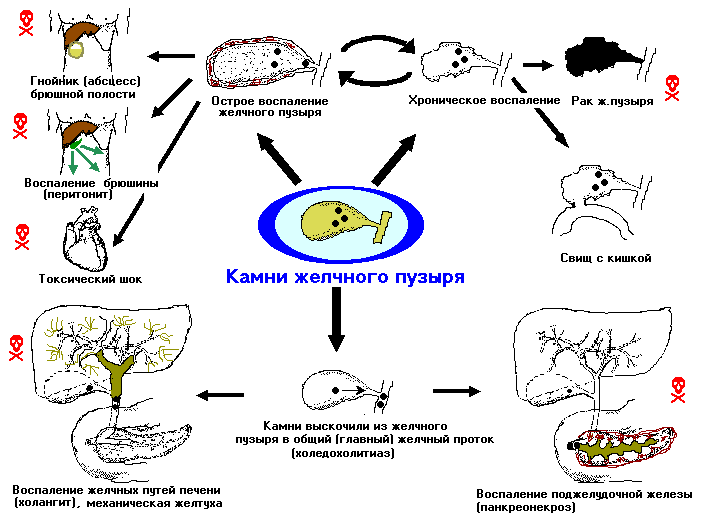 Ниже представленная схема в виде рисунка демонстрирует описанные здесь основные варианты осложнений желчно-каменной болезни.