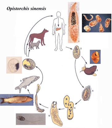 ую железу. Особенно часто встречается в Западной Сибири и Приднепровье. Возбудитель - двуустка сибирская, или кошачья (Opisthorchis felineus), паразитирует у человека, кошек, собак в печени, жёлчном пузыре, поджелудочной железе. Основной источник инвазии - больной человек, с калом которого, а также больных животных, яйца паразита попадают в воду, где их заглатывают улитки, в которых происходит размножение личинок паразита, заканчивающееся выходом в воду личинок-церкариев. Церкарии проникают в карповых рыб (язя, ельца, плотву и др.). Человек заражается при употреблении в пищу сырой, недостаточно прожаренной и слабопросоленной рыбы. В ранней стадии болезни - лихорадка, крапивница, ломота в мышцах и суставах, позднее - боли в правом подреберье, под ложечкой; часто увеличение печени и жёлчного пузыря. Лечение, всегда комплексное, ранее велось хлоксилом, ныне есть более совеременный и более эффективный препарат, празиквантел (билтрицид). Профилактика: употребление в пищу только хорошо проваренной и прожаренной, тщательно просоленной рыбы; охрана водоёмов от загрязнения фекалиями. У животных заражение происходит при поедании сырой, малосолёной и мороженой рыбы, инвазированной метацеркариями. При сильной инвазии животные истощены, с резко взъерошенной шерстью; аппетит часто повышен. Диагноз ставят на основе клинических и эпизоотологических данных, результатов лабораторных исследований. Для специфической терапии применяют гексахлорпараксилол и др. антгельминтики. Профилактика: в очагах описторхоза нельзя кормить животных сырой рыбой и др. Смотрите подробно далее. История, эпидемиология и реалии Возбудитель описторхоза человека — Opistorchis felineus был открыт К.Виноградовым, профессором Томского университета, более 100 лет назад. Тем не менее проблема описторхоза и сегодня не решена — он остается весьма распространенным заболеванием с упорным, рецидивирующим течением. В мире насчитывается около 21 млн человек, инфицированных печеночными трематодами (Clonorchis sinensis, Opistorchis viverrini и Opistorchis felineus), которые паразитируют у человека в желчных путях и протоках поджелудочной железы, вызывая сходные по клинике и патогенезу заболевания. Печеночные трематодозы относятся к паразитарным заболеваниям с природными очагами в поймах рек. На территории России, Казахстана, Украины и Белоруссии распространена кошачья, или сибирская, двуустка — Opistorchis felineus. Самый крупный и напряженный очаг описторхоза в мире — Обь-Иртышский, охватывающий 10 краев и областей России и Казахстана. В бассейне Среднего Приобья пораженность местного населения достигает 51—82% (в отдельных районах — 90% и более). Уже в 1-й год проживания в эндемичном очаге заражаются 11,5—17,9% новоселов, через 1,5 года — 42%, постепенно уровень инвазии растет, и через 10 лет показатели инвазированности местного и пришлого населения сравниваются. Другой интенсивный очаг описторхоза (частота поражения 70—80%; в отдельных пунктах — до 95%) существует в Красноярском крае на реке Чулым. Крупными очагами описторхозной инвазии являются также бассейн Днепра и его притоков, Волго-Камский, бассейн реки Неман. Описторхоз диагностируется у жителей Центральной России, Пермской области, Татарстана, а также Украины, Австрии, Венгрии, Германии, Голландии, Италии, Польши, Румынии, Швеции. Пути заражения описторхозом Заражение окончател