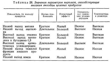 Одним из важных технологических параметров пиролиза является, так называемый, пленочный эффект. В трубчатом реакторе, непосредственно у его стенки образуется слой реакционной смеси, движущийся более медленно, чем основная масса потока. Пленочный эффект характеризуется заметно возрастающей температурой по радиальному направлению от центра к стенке трубы через пристенный слой. Вследствие этого и скорость реакций в пристенном слое выше скорости их в основном, центральном потоке, т.е. пристенный слой является как бы дополнительным источником образования свободных радикалов и способствует ускорению реакций в потоке в целом. Вместе с тем в пристенном слое ускоряются и вторичные реакции, поэтому пленочный эффект определяет скорость отложения кокса на стенке трубы. Обычно печь пиролиза рассчитывают так, чтобы степень превращения исходного сырья в пристенном слое не превышала 5% суммарного превращения сырья в потоке. Печи пиролиза, в которых 5%-й предел не выдерживается, рассчитаны для низких массовых скоростей потока, т.е. для очень больших либо очень малых (где скорость потока лимитирована перепадом давления) диаметров труб змеевика. В табл. 28 обобщены условия, способствующие высоким выходам целевых продуктов пиролиза.