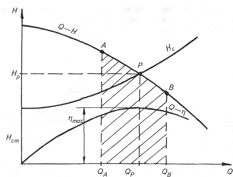 Насос выгодно эксплуатировать только в области высоких КПД и больших высот всасывания, поэтому при подборе насосов используется не вся характеристика насоса, а только ее часть, лежащая в зоне допустимого по сравнению с максимальным снижения КПД. Такая часть характеристики называется рабочим участком (участок АВ).