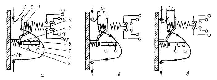5 – поворотный якорь; 6 – сердечник электромагнита; 7 – катушка электромагнита; 8 – гибкая перемычка; 9 – отключающая пружина; 10-11, 12-13 - неподвижные контакты; 14 – изоляционная плита (основание)