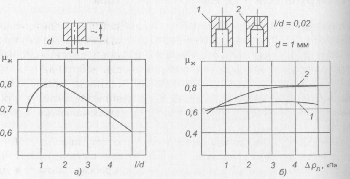 Величина μж определяется опытным путем, составляет 0,7—0,8 и зависит от состояния жиклера, соотношения его размеров (рис. 4), формы кромок жиклера, давления, температуры вытекающего топлива и пр.