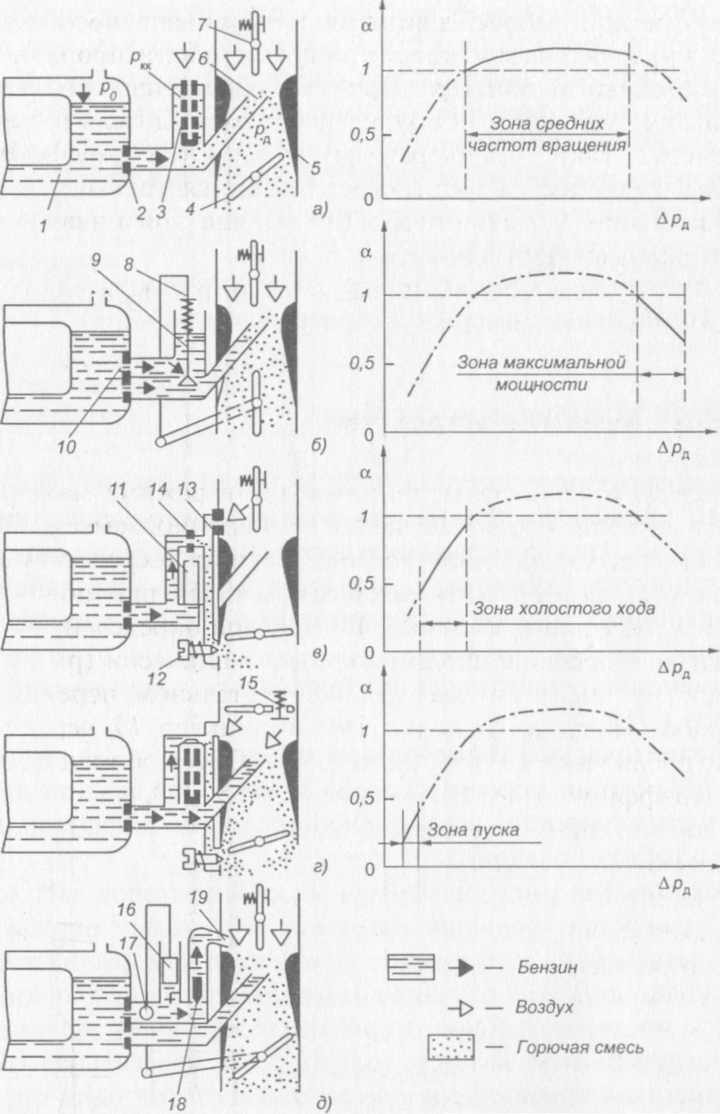 а —компенсация состава смеси; б — действие экономайзера; в — использование системы холостого хода; г — использование устройства для облегчения пуска двигателя; д — действие ускорительного насоса; 1 — поплавковая камера; 2 — главный жиклер; 3 — воздушный жиклер; 4 — дроссельная заслонка; 5 — диффузор; 6 — воздушная заслонка; 7 — распылитель; 8 — шток; 9 — клапан экономайзера; 10 — жиклер экономайзера; 11 — компенсационный колодец; 12 — регулировочный винт; 13, 14 — воздушный и топливный жиклеры системы холостого хода; соответственно; 15 — воздушный клапан; 16 — поршень ускорительного насоса; 17 — обратный клапан; 18 — клапан; 19 — форсунка