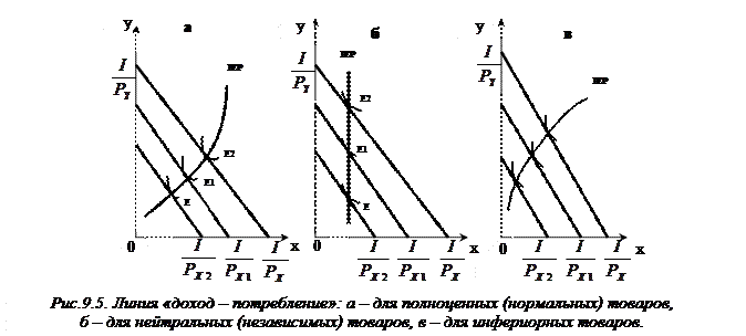 На рис. 9.5 а линия IЕР имеет положительный наклон, так как потребление полноценных благ, например бытовой техники, с ростом дохода потребителя растет. На рис. 9.5 б линия IEP имеет вид вертикали, если за нейтральный принят товар х (например, соль). Потребление инфериорных (худших) товаров с ростом дохода сокращается (низкие сорта колбасы). На рис. 9.5 в линия IЕР имеет отрицательный наклон. Следует подчеркнуть, что принадлежность товара к нормальным или инфериорным определяется личными вкусами потребителя, его предпочтениями.