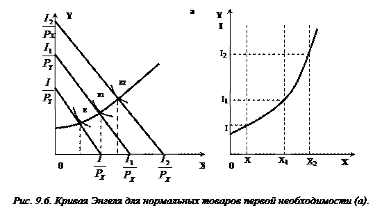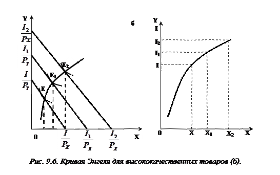 Угол наклона кривой Энгеля на рис. 10.6 а (справа) снижается, на рис. 9.6 б (справа) возрастает.