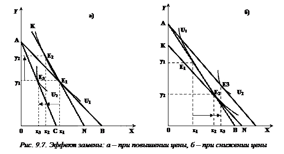 Новая цена на товар х заставляет потребителя произвести частичное замещение покупок товарах покупками товара у. Движение потребителя по прежней кривой безразличия прекращается, пока воображаемая бюджетная линия (KN), построенная параллельно новой бюджетной линии (АС), коснется прежней кривой безразличия. В точке Е2 потребитель сохраняет прежнюю полезность (находится на старой кривой безразличия) в условиях изменения цены товара х.