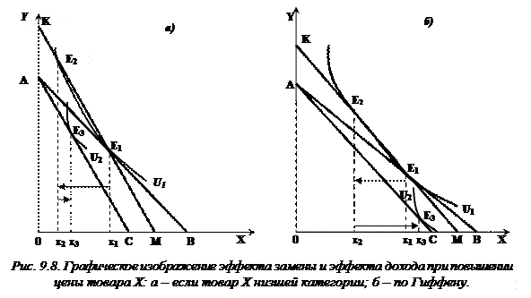 Если товар принадлежит к низшей категории, то эффект дохода действует в направлении, противоположном эффекту замещения. Окончательный эффект, т.е. общий эффект замены и дохода, неоднозначен. Возможна ситуация, когда эффект замещения для низших товаров сильнее эффекта дохода. Поэтому общий эффект изменения цены отрицательный. Так, на рис. 9.8. а общий эффект при повышении цены на товар х низшей категории разлагается на эффект замены х1 - х2 и эффект дохода х2 – х3. При повышении цены товара х потребитель сокращает покупку товара х, вначале перемещаясь по кривой безразличия U1, затем опускаясь на более низкую кривую безразличия. Соответственно новому реальному доходу потребитель уменьшает покупки обоих товаров, в том числе и товара х. Но эффект дохода слабее эффекта замены: (х1 - х2) > (х2-х3).