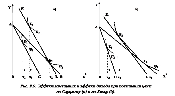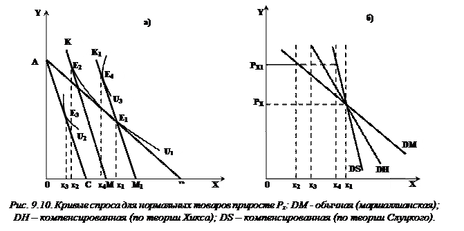 Компенсированная линия спроса может быть двух типов: кривая спроса по Хиксу и кривая спроса по Слуцкому (рис. 9.10 б).