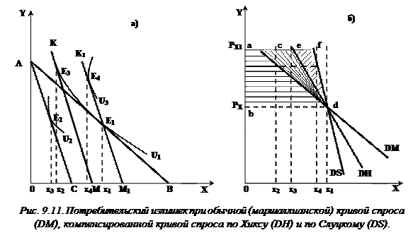 Анализ эффекта изменения цены имеет практическое значение и применяется при оценке последствий экономической политики, ее влияния на уровень благосостояния населения. Такие меры со стороны правительства, как введение налогов, изменение таможенных пошлин и т.д., изменяют излишек потребителя. Например, повышение таможенных пошлин автоматически приводит к росту цен на импортируемые и отечественные товары. Более высокие цены уменьшают потребительский излишек (рис. 9.11 а). Это относится к потребительскому излишку при обычном (маршаллианском) спросе. Если потребитель при росте цен получает компенсацию, то величина потребительского излишка приобретает иные значения: компенсация по Хиксу приведет к расширению потребительского излишка на геометрическое пространство сеd, компенсация по Слуцкому — на геометрическое пространство efd. При обычной кривой спроса потребительский излишек измеряется площадью трапеции acdb (рис. 9.11 б ).