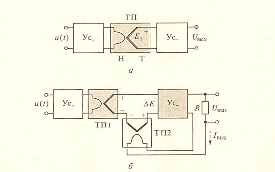 Таким образом, на входе усилителя Ус_ автоматически всегда поддерживается минимальная разность Δ Е двух термоЭДС: ТПl и ТП2.Благодаря такой отрицательной обратной связи заметно повышаются линейность и точность преобразования. Выходной ток