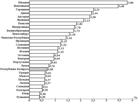 Рис. 6. Внутренние затраты на научные исследования и разработки в Республике Беларусь и странах ЕС в 2007 г., в процентах к ВВП [21]