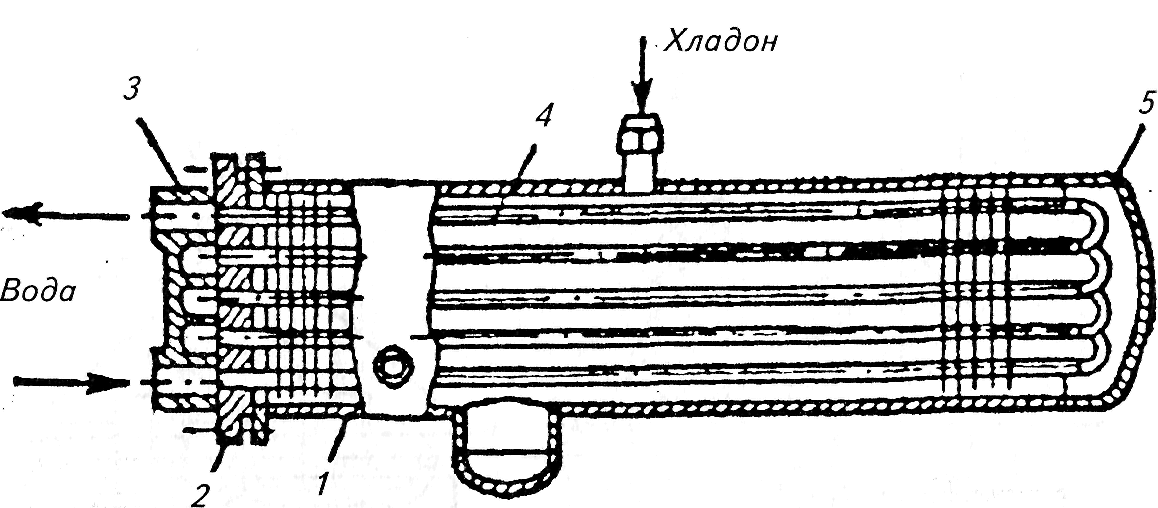 1- кожух; 2- трубная решетка; 3 - крышка; 4 - трубы; 5 - перегородка