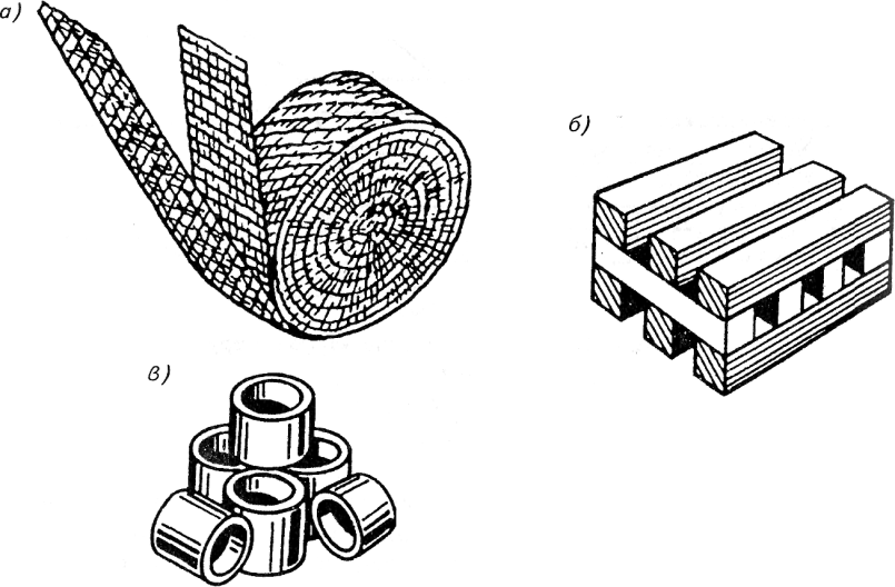 При низких температурах в криогенных регенеративных ТОА в качестве элементов насадки используется алюминиевая гофрированная лента (рис. 11.8, а). При намотке на диски двух лент образуются каналы, конфигурация которых способствует интенсификации процессов теплообмена при течении по ним теплоносителей. В зависимости от температуры, видов теплоносителей применяют различные виды насадок: огнеупорный кирпич (рис. 11.8, б); кольца Рашига (рис. 11.8, в).
