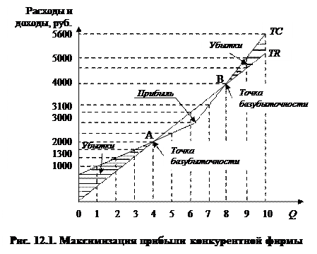 На основе показателей табл. 12.1 построен график (рис. 12.1). Обратим внимание, что на графике кривая общих издержек ТС исходит не из точки начала координат, потому что существуют постоянные издержки, которые остаются неизменными даже в тех случаях, когда объем производства равен нулю (например, плата за аренду помещения). Функция общего дохода имеет вид прямой линии, потому что цена остается прежней при изменении объема выпуска продукции. Каждая проданная единица добавляет к общему доходу 500 руб.