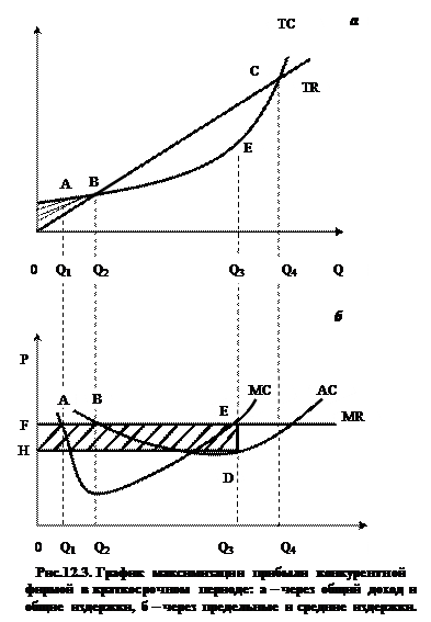 Условию максимизации прибыли на рис. 12.3 б соответствует точка Е. В точке А предельные затраты очень высокие. Объем выпуска продукции Q1 соответствующий предельным затратам в точке А невелик, поэтому фирма терпит убытки. Для получения дохода фирма вынуждена наращивать производство, предельные издержки постепенно снижаются. При объеме выпуска Q2 предельные издержки достигают своей минимальной величины. Данному значению МС соответствует равенство ТС и TR (на рис. 12.3 а точка В). Дальнейшее увеличение объема производства будет сопровождаться постепенным повышением предельных затрат. Однако общий доход превышает общие затраты, и фирма начинает получать прибыль. Наибольшую прибыль фирма получит при производстве продукции от Q2 до Q3 в точке E линия предельных издержек вторично пересекается с линией предельного дохода. В данной ситуации равенства МС=MR прибыль достигает своей максимальной величины.