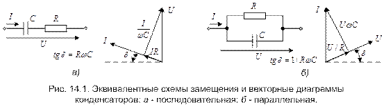 На рис.14.1,а и б показаны эквивалентные схемы замещения и векторные диаграммы двух наиболее распространенных способов представления конденсаторов - последовательной и параллельной схемами замещения.