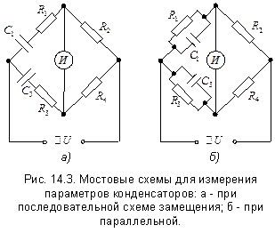 Мосты для измерения емкости и угла потерь конденсаторов. На рис.14.3,а,б показаны мостовые схемы для измерения параметров конденсаторов с последовательной и параллельной схемами замещения. Допустим, что конденсатор, параметры которого измеряются, включен в первое плечо моста и мост уравновешен.