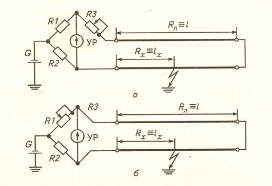 В схеме Варлея (рис. 14.5, а) кабельную линию включают в мост вместо одного из его плеч. При равновесии моста неизвестное сопротивление можно вычислить по формуле