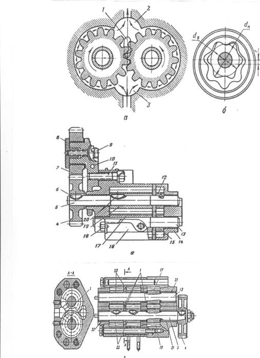 а - односекционный с шестернями внешнего зацепления; б — с шестернями внутреннего зацепления; в - двухсекционный насос; г - трехсекционный насос; 1 - разгрузочная канавка; 2 - нагнетательная полость; 3 - всасывающая полость; 4 - ведомая шестерня; 5 - ведущий валик; б и 20 -шпонки; 7 - промежуточная шестерня; 8 - упорный фланец; 9 - болт крепления промежуточной шестерни; 10 - ось промежуточной шестерни; 11 - болт крепления оси; 12 - ведущая шестерня радиаторной секции; 13 - ось ведомых шестерен; 14 - корпус радиаторной секции; 15 - ведомая шестерня радиаторной секции; 16 - корпус нагнетательной секции; 17 — ведомая шестерня нагнетающей секции; 18 - стяжной болт; 19 - ведущая шестерня нагнетающей секции; 21 - втулки шестерен; 22 - ведущие шестерни откачивающих секций; 23 - ведомые шестерни откачивающих секции.