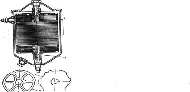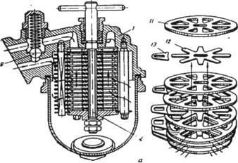 Пластинчато-щелевой фильтрующий элемент (рис 4. а) состоит из набора пластин, между которыми установлены дистанционные звездочки, образующие зазоры для прохода масла. Такие фильтры обеспечивают, очистку масла от посторонних включений размером более 60—70 мК.