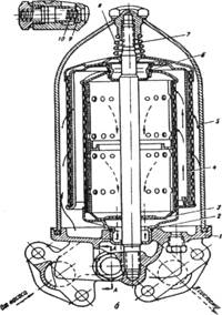 Кроме того, для тонкой очистки масла широко применяются центробежные фильтры. Фильтры тонкой очистки могут иметь различные типы привода: гидравлический, механический, пневматический или электрический. На двигателях армейских машин наиболее распространены центрифуги с гидравлическим приводом. В качестве примера на рис. 5.а изображен центробежный фильтр тонкой очистки дизеля ЯМЗ-238.