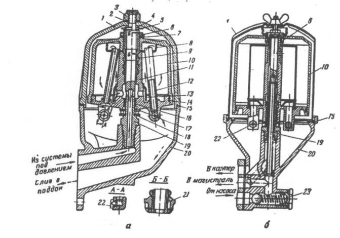 А - параллельного включения в систему; б - полнопоточный; 1 -колпак фильтра; 2 и 7 - шайбы; 3 - колпачная гайка; 4 - упорная шайба ротора; 5 - чека; 6 - гайка ротора; 8 - сетка; 9 - втулка ротора; 10 — колпак ротора; 11 - корпус ротора; 12 - заборная трубка; 13 - отражатель; 14 - уплотнительное кольцо; 15 - прокладка колпака; 16 - втулка ротора; 17 - стопорное кольцо; 18 - подшипник; 19 - ось ротора; 20 - корпус фильтра; 21 - штифт; 22 - сопло ротора; 23 - перепускной клапан.