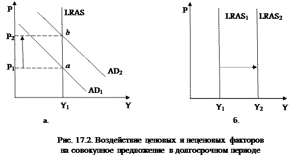 В долгосрочном периоде величина совокупного предложения не зависит от уровня цен, поскольку цены на товары и цены на ресурсы совершенно гибкие, изменяются пропорционально друг другу. Поэтому все рынки приходят в состояние взаимного равновесия. Кривая долгосрочного совокупного предложения LRAS (longrun aggregate supply curve) имеет вертикальный вид. Реальный выпуск продукции находится на потенциальном уровне. Потенциальный объем выпуска производится при использовании всех имеющихся в экономике ресурсов и существующей технологии. Привлечение дополнительных ресурсов в условиях полной занятости возможно при условии повышения цен на эти ресурсы, например, номинальной заработной платы. В результате величина выпуска остается прежней, но уровень цен растет от Р1 до Р2 (рис.17.2 а).