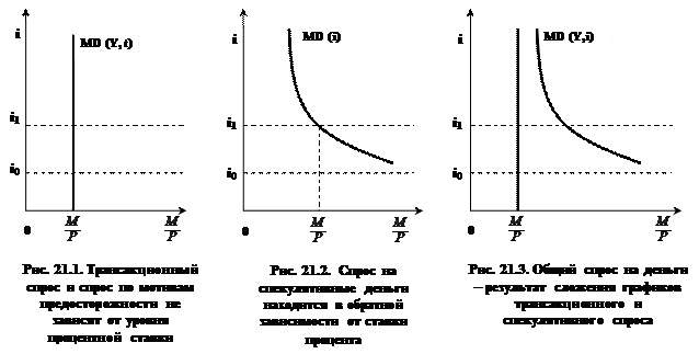 Графически в координатах «процентная ставка – количество денег» совокупный спрос на деньги формируется путем горизонтального сложения графиков трансакционного и спекулятивного спроса. Линия спроса на деньги – кривая с отрицательным наклоном (рис. 21.1, 21.2, 21.3).