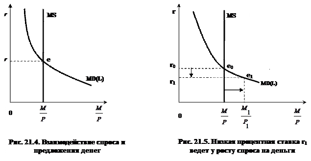 На графике (рис. 21.4) предложение денег MS представлено вертикальной линией, спрос на деньги – убывающая функция ставки процента.