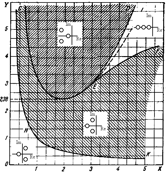 на две подобласти (рисунок 3.5) – подобласть с малой колебательностью (область, ограниченная кривой GED и соответствует расположению корней, когда вещественный корень по отношению к паре комплексно сопряженных корней находится ближе к оси) и подобласть с существенной колебательностью (область, ограниченная кривой GEF и гиперболой GHK соотвествует расположению корней, когда пара комплексно сопряженных корней по отношению к вещественному корню находится ближе к оси).