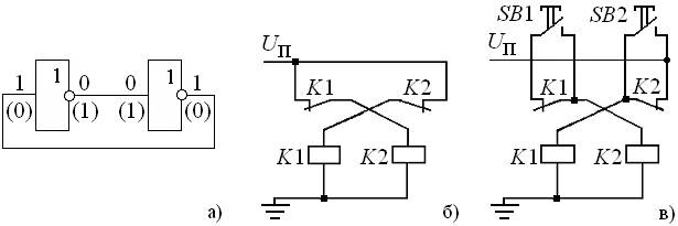 Устройство (рис. 1, а) может находиться в двух устойчивых состояниях входов – выходов, соответственно 1–0–0–1 и 0–1–1–0. Такая ячейка памяти называется бистабильной. Она может быть реализована на основе реле K 1, K 2 с нормально замкнутыми контактами K 1, K 2 по схеме рис. 1, б. При подаче напряжения U п одно из реле сработает быстрее и разомкнет цепи питания другого реле. Однако таким устройством нельзя управлять.