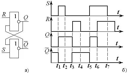 Асинхронный RS -триггер может быть реализован с помощью элементов 2ИЛИ-НЕ (рис. 4, а), таблица истинности (табл. 1). Он имеет два входа: S (et) установка (Q =1) и R (eset) сброс (Q =0).