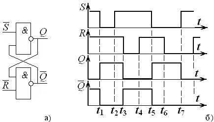 Асинхронный RS -триггер может быть собран на элементах 2И-НЕ (рис. 5, а), таблица истинности (табл. 3). В отличие от предыдущей схемы, триггер имеет инверсные входы.