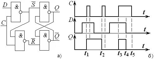 На рисунке 7 представлен синхронный потенциальный D -триггер. Если при наличии тактового сигнала C (интервал t 3 – t 5), происходит изменение входного сигнала D (в момент времени t 4), то это оказывает влияние на состояние выходов.