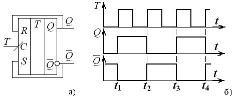 Согласно временной диаграмме, в исходном состоянии Q =0, Q ’ =1, на входе R =0, S =1. По переднему фронту тактового импульса T =1 сигналы с выходов запишутся в триггер и установятся новые значения Q =1, Q ’ =0 (в момент времени t 1). Очередной тактовый импульс запишет их в триггер и в момент времени t 2 установятся значения Q =0, Q ’ =1.