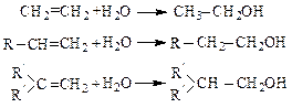 Все олефины, за исключением этилена, при гидратации образуют вторичные или третичные спирты. Так как присоединение воды к олефинам всегда происходит по правилу Марковникова. Правило Марковникова находит объяснение с позиции электронной теории органических реакций. Вследствие того, что электроотрицательность углерода больше, чем водорода, углерод в метильной группе СН3 несет на себе некоторый отрицательный заряд. Это приводит к сдвигу σ-электронов связи Н3С – СН в направлении центрального атома углерода. Этот сдвиг в свою очередь влечет за собой гораздо большее смещение подвижных π-электронов двойной связи в направлении, указанной изогнутой стрелкой: