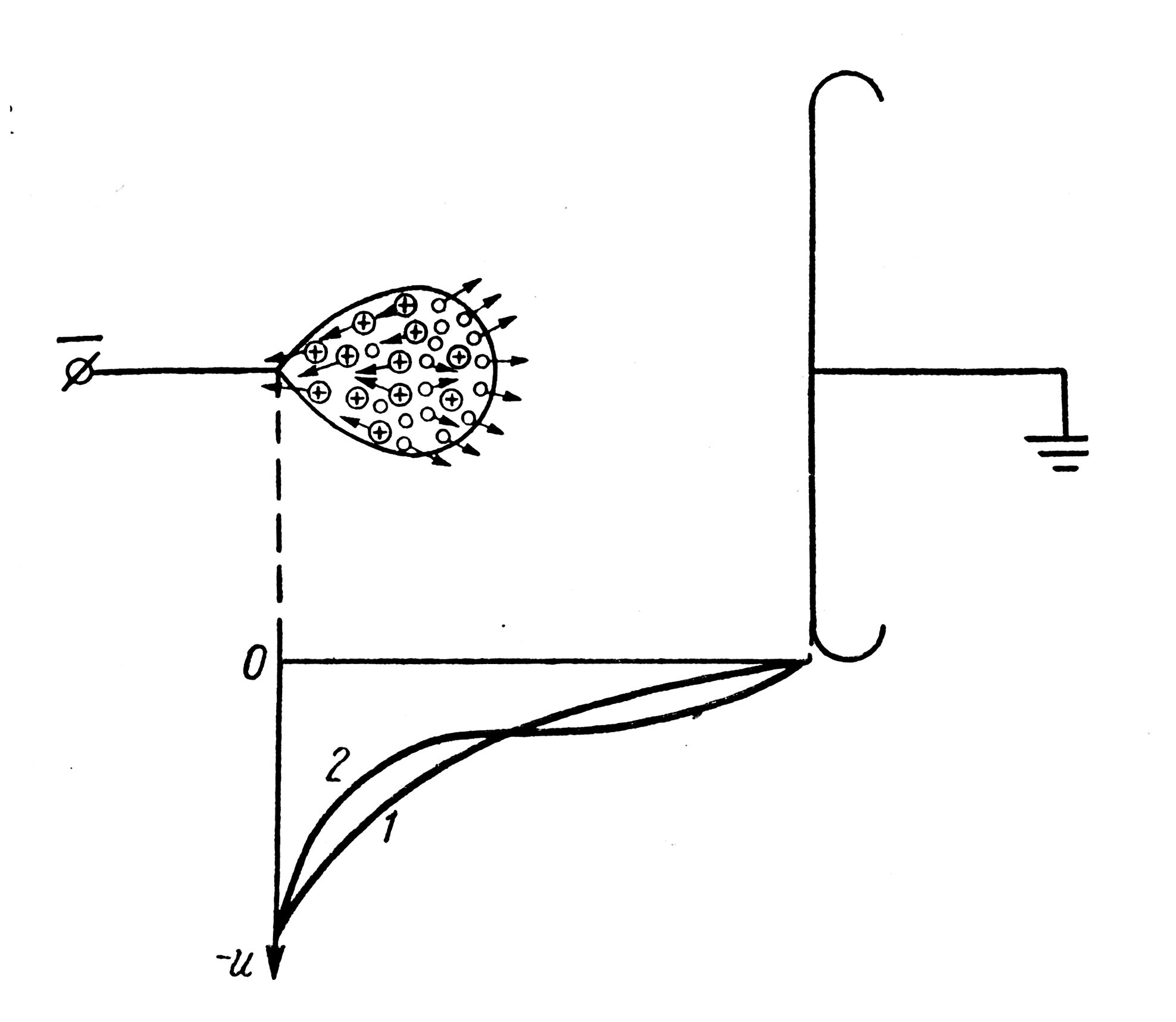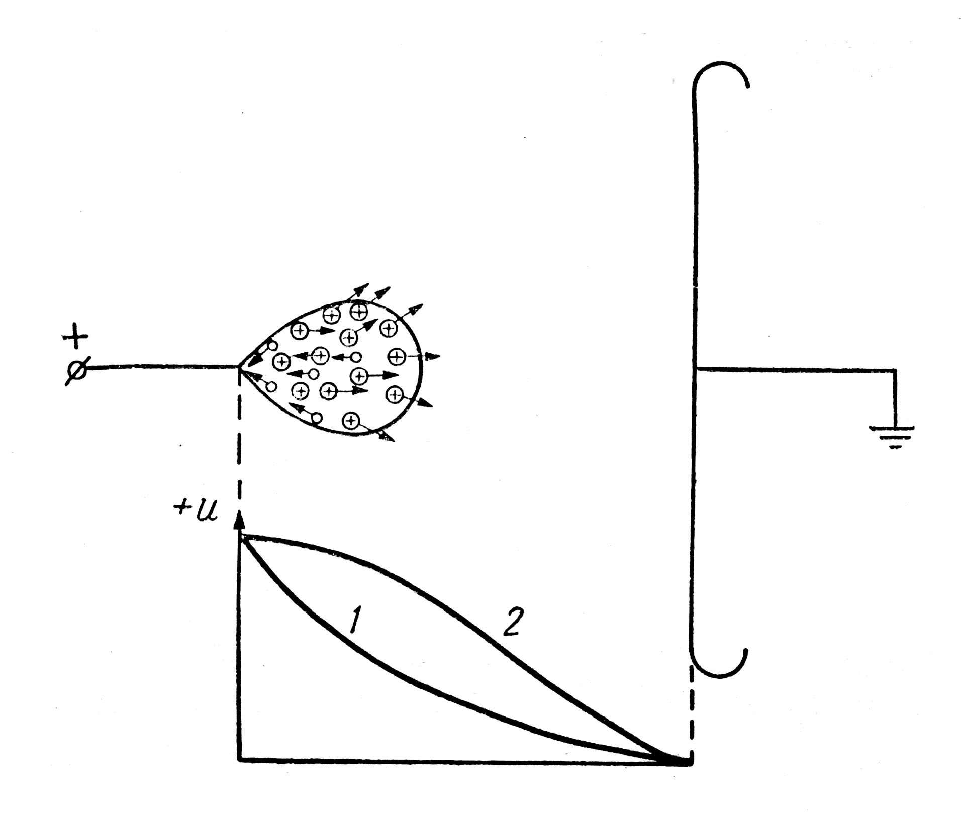 При положительной полярности стержня электроны, двигаясь от плоскости к игле, ионизируют нейтральные частицы и, образуя лавину электронов уходят на иглу. Положительно заряженные ионы, которые тяжелее электронов в 1836 раз, остаются в пространстве и медленно перемещаются к противоположному электроду. Таким образом, вблизи стержня создаётся положительный объёмный заряд, где направление напряжённости внешнего электрического поля и объёмного заряда совпадают.