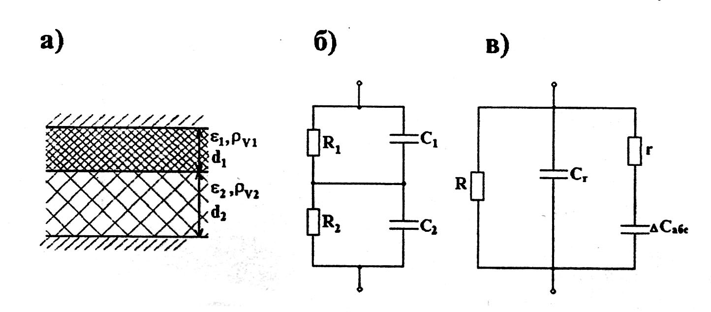 Двухслойный диэлектрик (а) и схемы замещения (б, в)