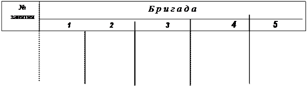 Смена работ в бригадах делается по специально составленному скользящему графику. Составляя график, учитывают число учащихся в классе, число работ практикума, наличие оборудования. В табл. 1 приведен пример такого графика, составленный исходя из следующих данных: в классе 30 учащихся, в каждой подгруппе – 15, работают за установкой по 3 человека, всего 5 бригад. В практикум входят 5 работ, каждая лабораторная работа должна быть представлена в трех экземплярах. Необходимо строгое соблюдение графика – это важный принцип эффективной организации практикума.