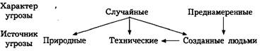 | 1.1. Стихий-ные бедствия 1.2. Магнит-ные бури 1.3. Радио-активные излучения и осадки 1.4. Другие угрозы | 2.1. Сбои в работе аппаратуры, вызванные отключением или колеба-нием электропитания или другими средствами функционирования аппаратуры 2.2. Отказы и сбои аппаратуры вследствие её ненадёжности 2.3. Электромагнитные излучения и наводки 2.4. Утечки через каналы связи – электрические, акустические, оптические и др. 2.5. Другие угрозы | 3.1. Непреднамеренные действия: 3.1.1. Обслуживающего персонала 3.1.2. Пользователей 3.1.3. Архивной службы 3.1.4. Службы безопасности 3.1.5. Управленческого персонала 3.1.6. Других людей 3.2. Преднамеренные действия: 3.2.1–3.2.5. Лиц по пунктам 3.1.1–3.1.5. 3.2.6. Хакерские атаки 3.2.7. Другие угрозы |