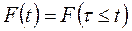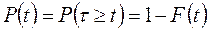 Обозначим через t время работы до отказа (для невосстанавливаемого объекта), на отказ или между отказами (для восстанавливаемого объекта) или суммарную наработку объекта соответственно до отказа, на отказ или между отказами. Далее для простоты отвлечёмся от понятий «восстанавливаемый» и «невосстанавливаемый» объект, и названную переменную t упрощённо будем называть наработкой до отказа. Возникновение отказа – случайное событие, поэтому наработка τ от начального момента до возникновения этого события – случайная величина. Тогда вероятность F(t) того, что значение τ не превысит переменной величины t, т.е. F(τ<=t),