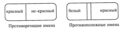 Противоречащими являются, например, имена «умелый» и «неумелый», «стойкий» и «нестойкий», «красивый» и «некрасивый» и т.п. Противоречат друг другу также имена «простое число» и «число, не являющееся простым», исчерпывающие объем родового имени «натуральное число», имена «красный» и «не являющийся красным», исчерпывающие объем родового имени «предмет, имеющий цвет», и т.п.