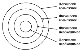 С помощью круговых схем отношения между логически необходимым, физически необходимым, физически возможным и логически возможным представляются четырьмя концентрическими кругами. Все логически необходимое необходимо также физически. Все физически необходимое, а значит, и включающееся в него логически необходимое, включается в физически возможное. Самой широкой категорией является логически возможное. Оно включает три другие категории в указанном их порядке.